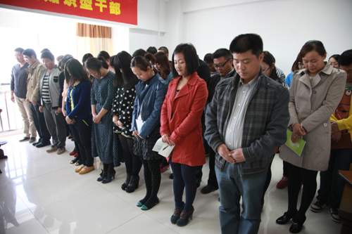 图为:新区宣传部的干部职工向灾区遇难同胞默哀