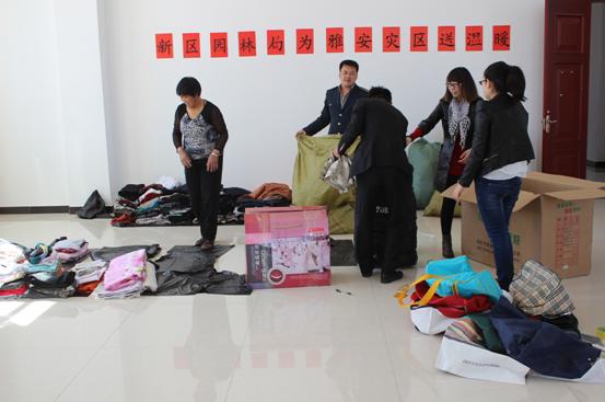 图为:新区园林局正在整理捐助的衣物
