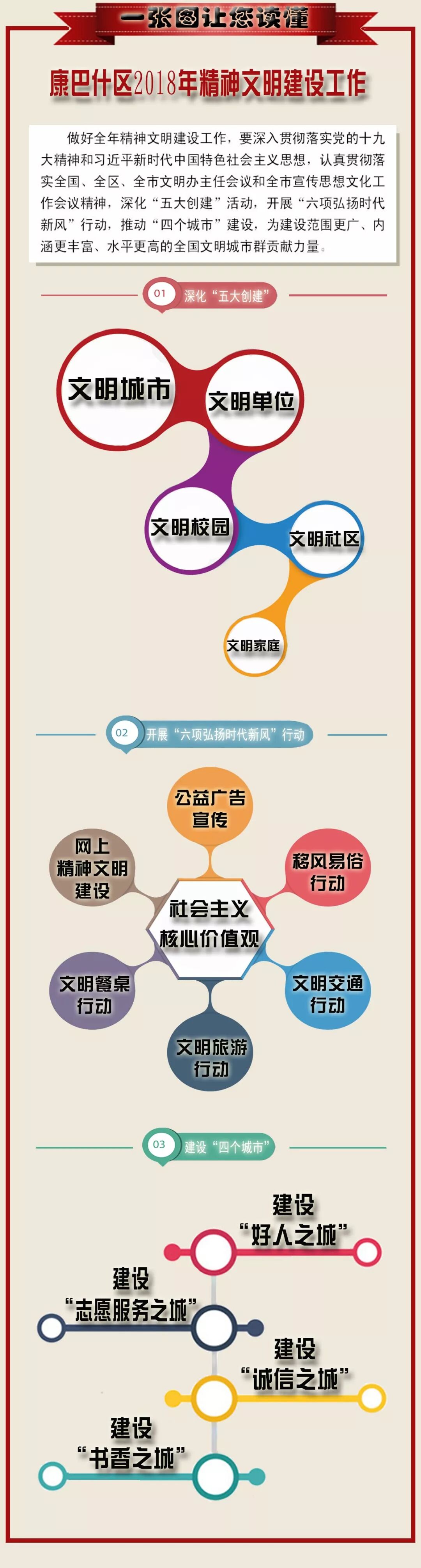 深化“五大创建” 一是深化文明城市创建。加强统筹规划,制定出台《文明城市创建三年行动计划》,做好全国、全区文明城市(区)测评验收工作。继续推行“智慧创城”平台建设,制定“创城工作监督管理办法”,明确督查问责,全面施行“一把手”制度,推动文明城市创建精准化、常态化、长效化,确保城市公共环境、公共秩序、宣传氛围等达到测评A类标准。 二是深化文明单位创建。持续加大创建指导力度,推动更多区级单位(标兵)晋级,重点抓好“八个一”项目建设。深入推进“双美双优”窗口创建活动,推动窗口服务行业细化服务规范标准、提高服务质量。区文明办将加强对驻区各级文明单位日常监管,确保通过各级文明办暗访测评。同时加强与驻区各级文明单位合作共建,拓宽文明单位活动开展的渠道。继续组织文明单位与社区、学校结对共建,推动经济条件较好、具备帮扶能力的文明单位发挥自身优势,提升被帮扶单位的软硬件水平。 三是深化文明社区创建。文明办牵头抓总,各街道统筹规划、协调指导,发挥住建、综合执法、公安、工商、消防等部门的职能,积极参与,齐抓共管,完善社区基础设施建设,提升社区秩序环境,引导街道、社区、物业公司和居民积极参与到创建活动中。通过开展各类扎实有效的创建活动,丰富居民业余生活,提升市民文明素质。 四是深化文明家庭创建。组织开展第二届康巴什区文明家庭评选表彰,充分发挥相关部门职能,确保到2020年,50%的家庭参与文明家庭创建活动。利用社区宣传栏、善行义举榜、公益广告等,弘扬传统家庭美德和文明家庭理念。组织开展家风评议、网上家风交流展示活动,使好家风教育感染更多群众。以“家和万事兴”为主题,开展“传家训、立家规、扬家风”主题活动,组织开展“忆家风、谈家训、讲最美家庭故事”巡讲、文明家庭故事会巡讲巡演活动。 五是深化文明校园创建。制定文明校园创建工作规划,实行季度督查、年度测评,加强文明校园考核管理,确保文明校园创建活动全覆盖。评选表彰第二届康巴什区级文明校园,争创市级以上文明校园。做好各级各类城市、乡村学校少年宫的申报、培训和管理工作,打造学校少年宫特色活动。加强校外未成年人心理健康辅导站使用和管理,充分发挥辅导站作用。推动社区健全完善未成年人活动场所,组织开展“社区儿童节”、志愿服务、假期实践等未成年人乐于参与的活动。组织“十九大精神进校园”、“扣好人生第一粒扣子”、“苏敦娜荷雅”教育实践活动。开展“新时代好少年”评选学习宣传活动。开展征集评选传唱优秀童谣、经典诵读等活动,引导未成年人自觉培育和践行社会主义核心价值观。做好迎接全国、全区未成年人思想道德建设测评工作。 开展“六项弘扬时代新风”行动 一是持续推进公益广告宣传。重点建设一批公益广告主题街道、社区、小区,扩大公益广告宣传的覆盖面。自主设计制作与康巴什城市景观相融合、与市民欣赏习惯相契合的公益广告,进行广泛刊播展示。在区域连接主干道、城市主要交通路口建设一批形式多样、主题鲜明的核心价值观宣传小品、宣传栏。 二是持续推进移风易俗行动。发挥党员干部的示范作用,以党风带民风。发挥新乡贤的示范引领作用,建设新乡贤文化。持续办好“我们的节日”。发挥传统节日的思想教育和文化熏陶功能,引导群众摒弃陋习、移风易俗。 三是持续推进文明交通行动。开展行人闯红灯、机动车不礼让行人、不文明驾驶等交通陋习专项整治行动,开展文明交通进学校、进社区、进家庭、进企业集中宣传活动,引导人们自觉遵守交通规则,养成文明交通习惯。 四是持续推进文明旅游行动。建立文明旅游联席会议制度。在旅游景区、旅游集散地、出入境大厅等位置设置宣传提示牌,在主要媒体开设专栏,制作文明旅游公益广告,加强正面宣传和反面曝光。常态化文明旅游志愿服务活动。加强对旅行社、导游、领队的培训和管理,落实旅游合同制度,督查旅行社遵守文明旅游相关规定和落实《游客不文明行为记录管理暂行办法》情况。 五是持续推进文明餐桌行动。制作刊播一批公益广告,在全社会做好舆论引导。在餐饮企业集中开展“文明餐桌”大行动,引导消费者形成文明用餐习惯。倡导集体婚礼、婚事新办、丧事简办,开展健步走、骑行等绿色出行活动,以文明风尚引领社会风尚。 六是持续推进网上精神文明建设。升级改版康巴什文明网。深入实施网德工程,联合网信、公安等部门广泛开展争做中国好网民活动。积极参与网络文明传播“万人计划”,引导人们提升网络素养,净化网络环境。广泛开展网络公益行动。制定信息报送奖惩制度,继续加强信息宣传工作。 建设“四个城市” 一是建设“好人之城”。积极参与第六届全区、全市道德模范评选。组织开展道德模范进机关、进社区、进校园“巡讲巡演”活动。全面启动区级道德模范、身边好人等典型人物评选表彰活动,建立健全善行义举嘉许礼遇制度。 二是建设“志愿服务之城”。常态化开展志愿服务工作,完善嘉许激励机制。培育一名志愿服务带头人,打造创城、环保、扶贫、文化旅游等重点志愿服务品牌,推广运用好志愿服务网络系统,做好志愿服务典型推荐。按照“五有标准”,管好用好志愿服务站
