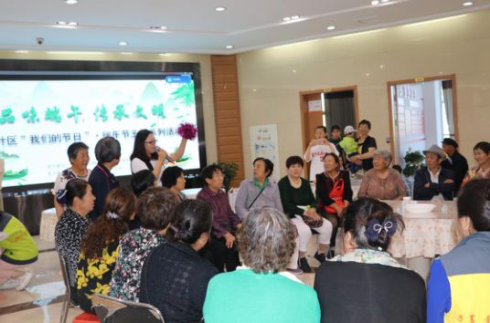 志愿者为老人吃“爱心粽” 活动中还设有击鼓传花、巧夹乒乓球、两人抱球等精彩游戏环节,整个表演环节有序地开展,整个场面欢声笑语接连不断,传递着浓浓的邻里情。