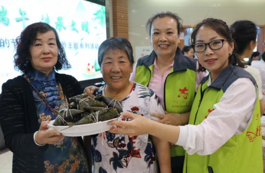 活动现场合影 活动现场内蒙古好人石伟东、鄂尔多斯好人李军梅、贾宝玉及65名志愿者和辖区老人们欢聚一堂,大家展示包粽子技巧,并和老人们悉心交谈,倾听、排解老人们孤单的情绪,其乐融融。大家在包粽子过程中回顾了端午节的来历和一些关于端午的典故,中华传统文化随着一片片粽叶、一粒粒糯米在居民的沟通中得到传承,一句句问候让老人感受到了节日的喜悦。